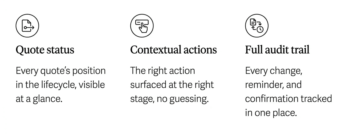 The same button position, different label at every stage. The action surfaces based on where the quote is in the lifecycle, not where the admin remembers to look.